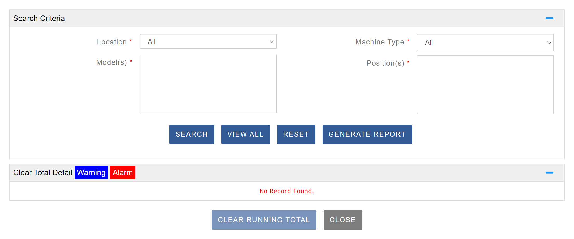 The Clear Running Totals page allows you to reset the accumulated totals for your coin boxes. Before clearing any totals, ensure that values have been added to your coin boxes as described in the Add Coin Box Values section. From this page, you can manage your alerts and reset the counters for individual machines as needed. The interface displays each machine’s current Running Total along with other related details. To clear totals, select the desired machines and click Clear Running Totals. Once the process is complete, a confirmation message will appear indicating Successful.