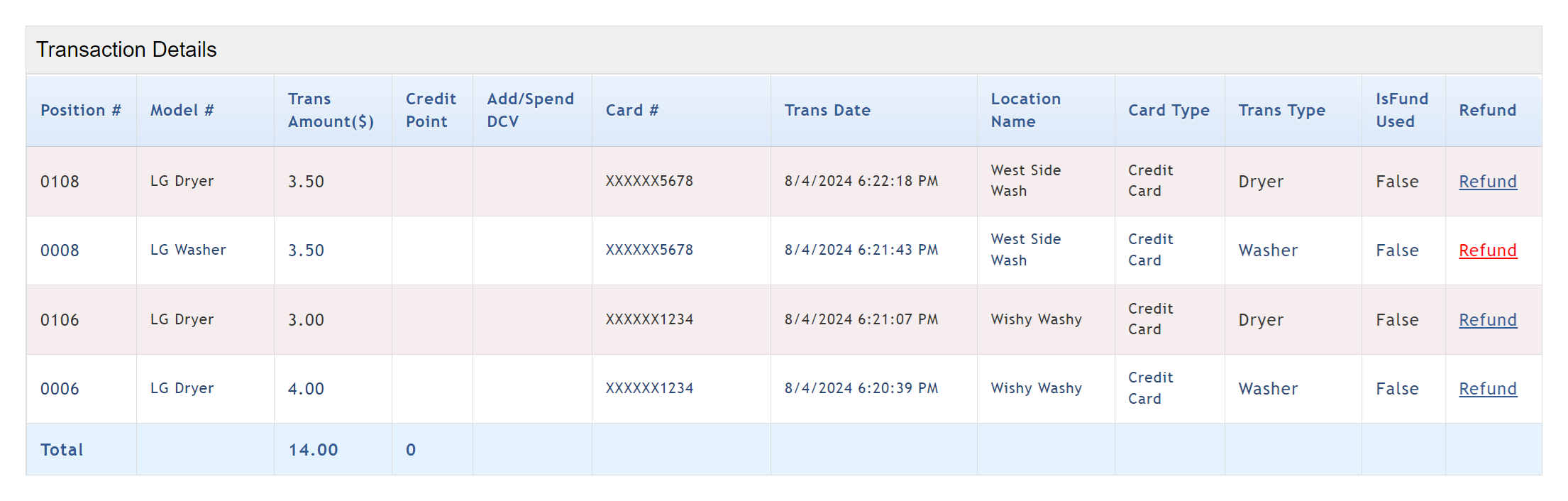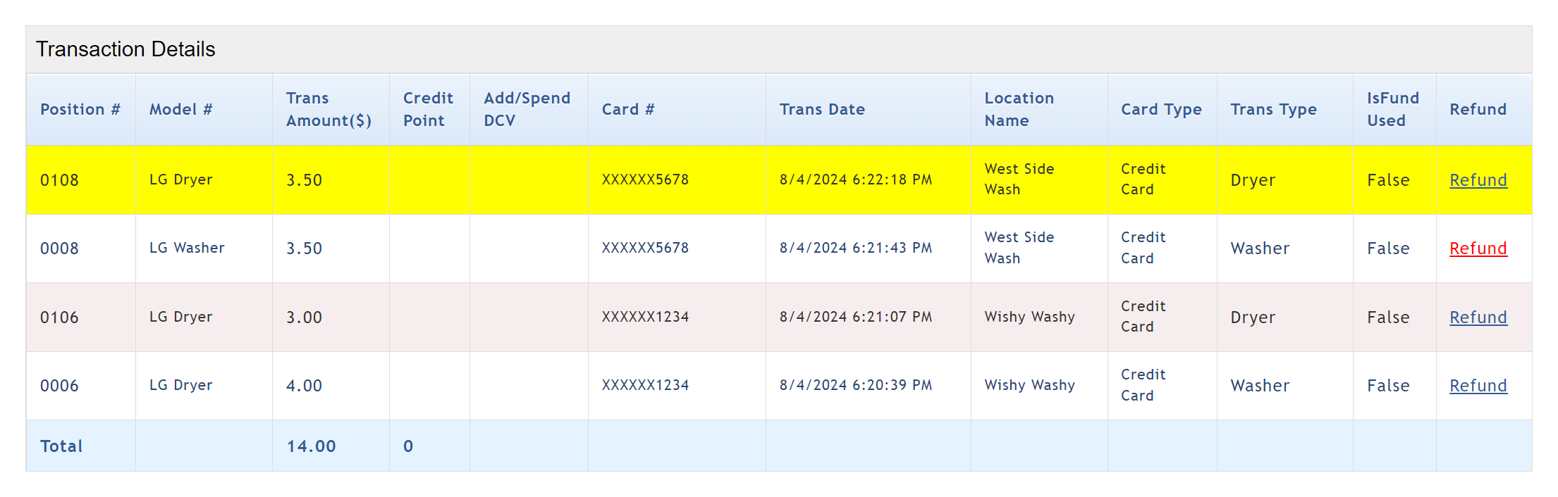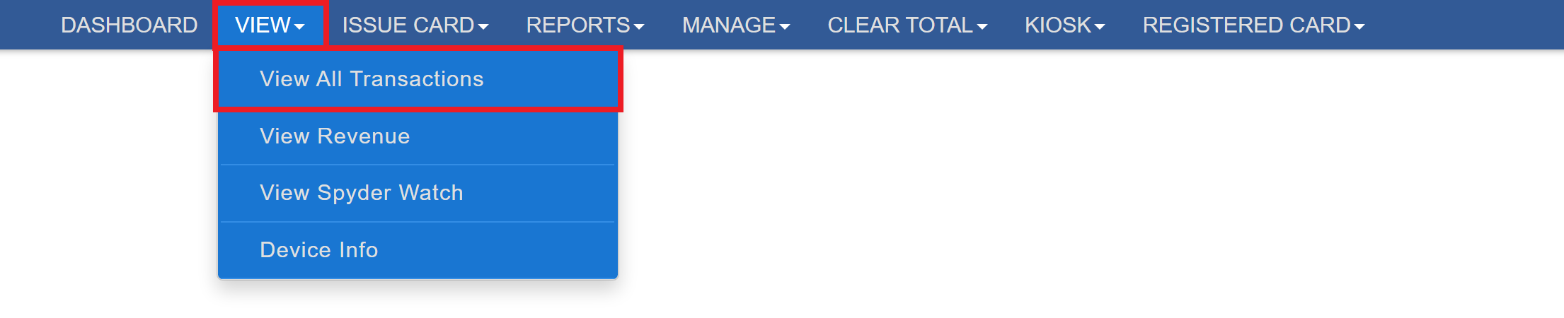 The View All Transactions page offers a real-time snapshot of all recorded cash, credit/debit, and SpyderWash loyalty card transactions. From here, you can issue refunds and generate a gross revenue report.