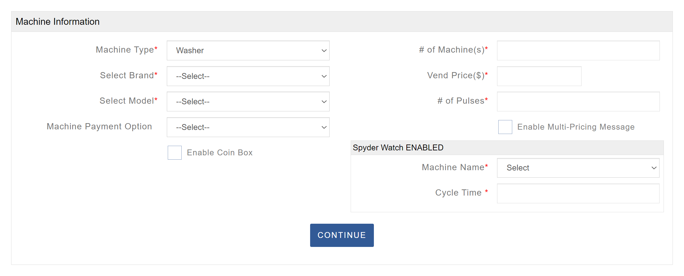 The View Spyder Watch page allows you to see machine availability exactly as your customers would. If the feature is not yet enabled, follow the steps in Enabling Spyder Watch first. On this page, machines that are Available are highlighted in green, machines that are Busy appear in yellow with a countdown timer, and machines marked Out of Order during configuration will display in red. The page automatically refreshes every 60 seconds, with a countdown indicating the time until the next update. You can also set up an Email Alert under Set Alert to notify you when a specific number of washers or dryers become available. To give your customers or residents access to Spyder Watch, proceed to Manage Spyder Watch Password.