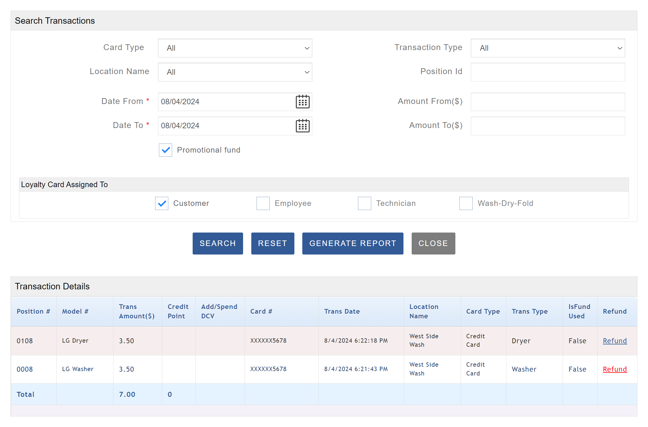 The Transaction Search tool is one of the most powerful features in your portal, allowing you to search and review approximately 99% of your transactions. Its strength lies in the ability to specify multiple search criteria, including payment type, location (if you manage more than one), date range, and transaction type. Selecting ‘Washer’ or ‘Dryer’ as the transaction type enables additional filters, such as Position or Bluetooth ID. You can also filter by specific loyalty card types. After entering your criteria and clicking Search, a list of transactions will appear at the bottom of the page, providing a live snapshot of your gross revenue at that moment. The page can be refreshed to capture any new transactions, and your Total Gross Revenue is displayed in the third column at the bottom.