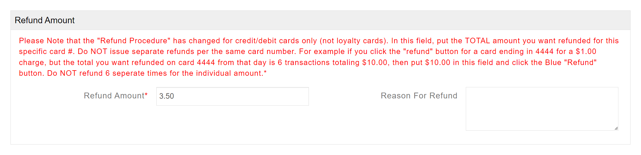If you need to issue a refund for more than one transaction processed on the same Credit Card or Loyalty Card, do NOT issue them separately. For example, if a customer has four transactions totaling $10.00, you would issue one refund in the amount of $10.00. Do NOT issue a refund for each transaction.