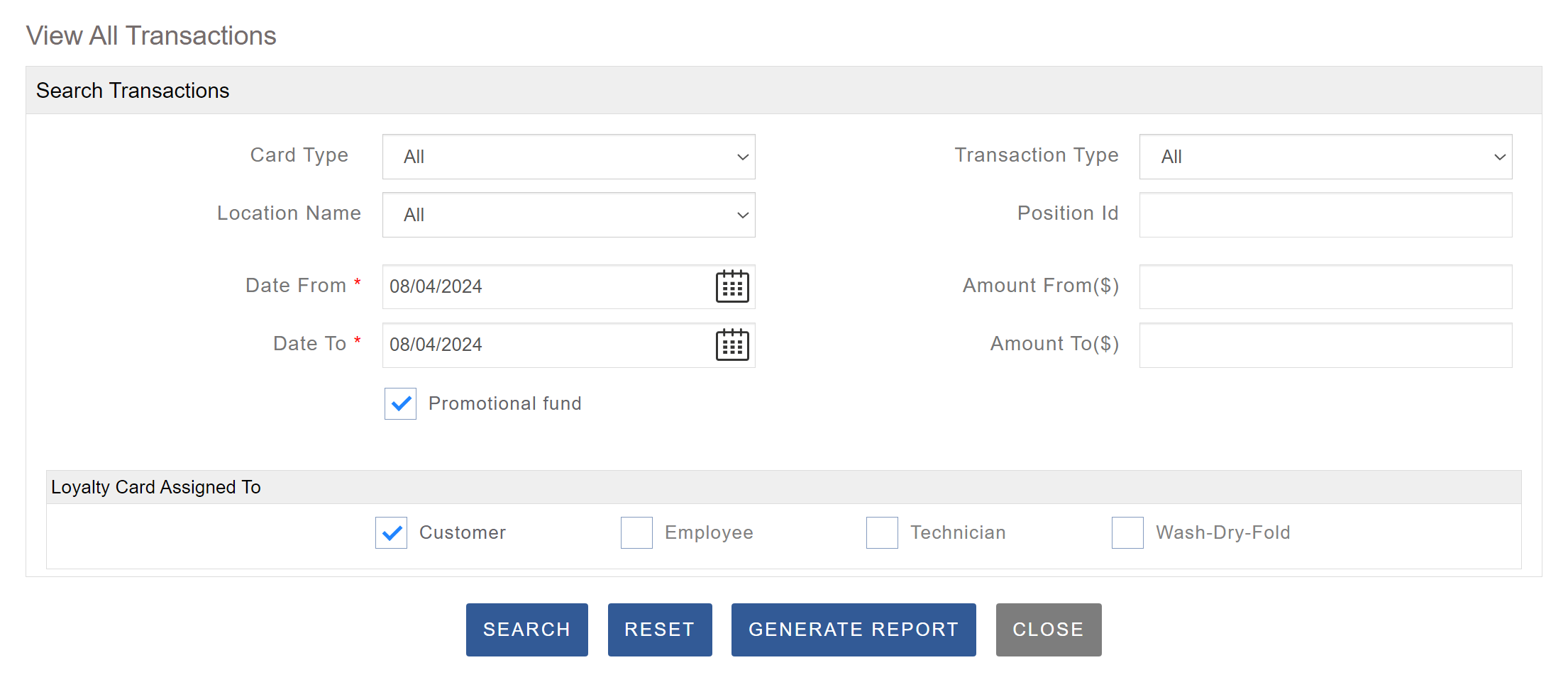 You can search for and filter transactions by payment type, location, date range, transaction type, and amount.